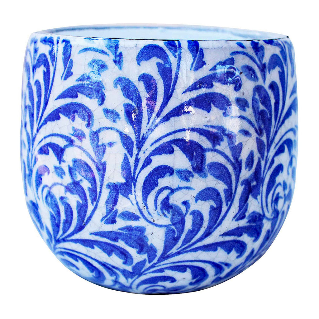 Old World Hand-Pressed Blue and White Ceramic Feather Pattern Far Belly Round Pot Overall measures 6.5 inches tall, 6 inches in opening, Featuring highly stressed painted and natural finishes creating a accent art piece;